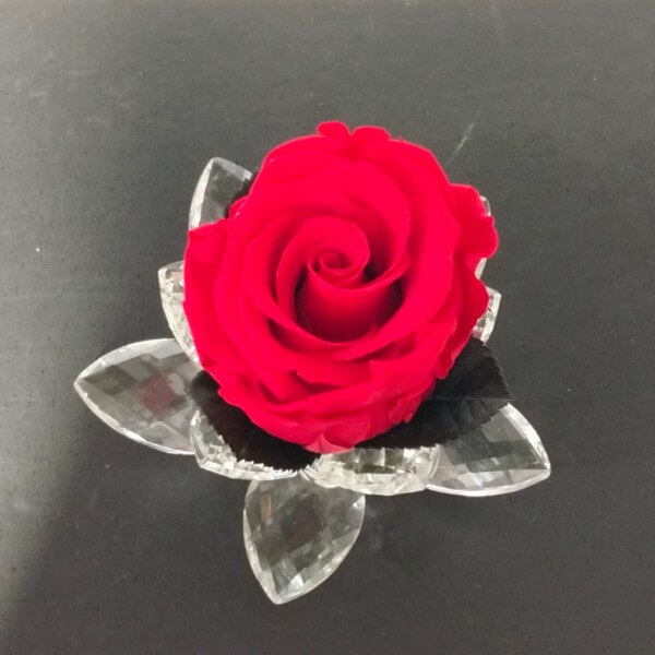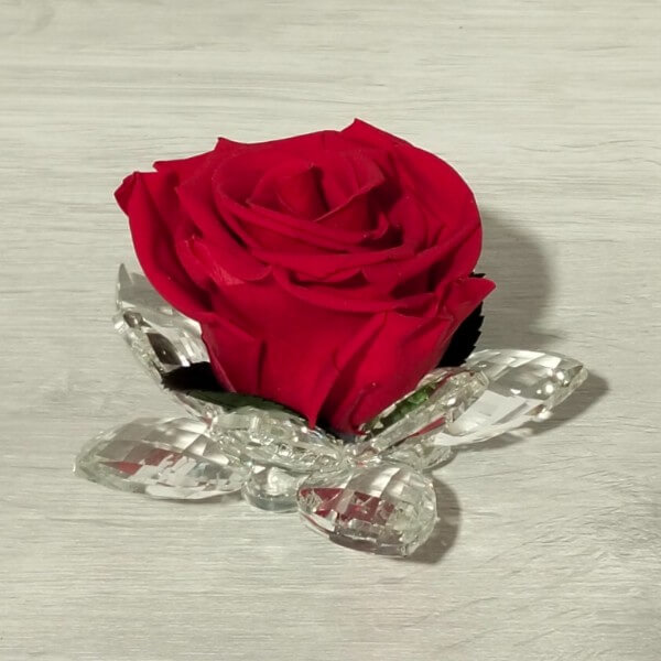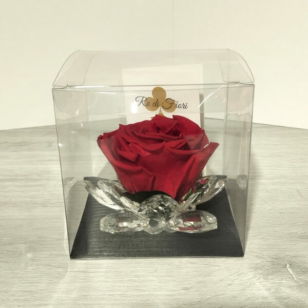 Una Rosa stabilizzata rossa racchiusa in una ninfea Cristallo e confezionata in box di pvc.